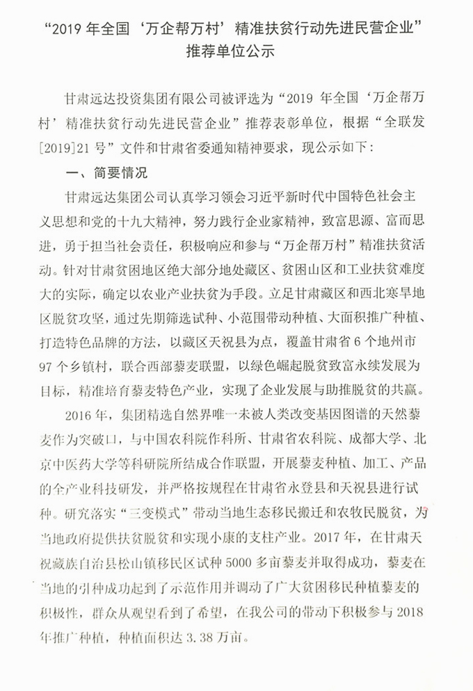 “2019年全國(guó)‘萬(wàn)企幫萬(wàn)村’精準(zhǔn)扶貧行動(dòng)先進(jìn)民營(yíng)企業(yè)”推薦單位公示