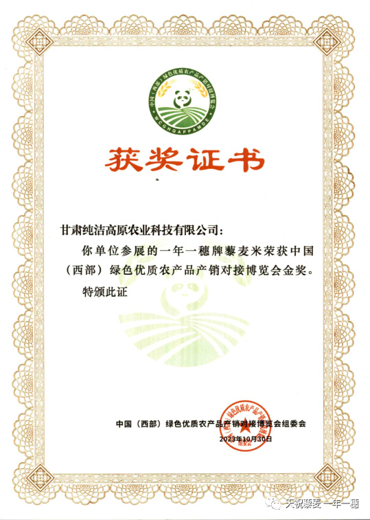 甘肅純潔高原“一年一穗牌藜麥米”榮獲中國(西部)綠色優(yōu)質(zhì)農(nóng)產(chǎn)品產(chǎn)銷對接博覽會(huì)金獎(jiǎng)