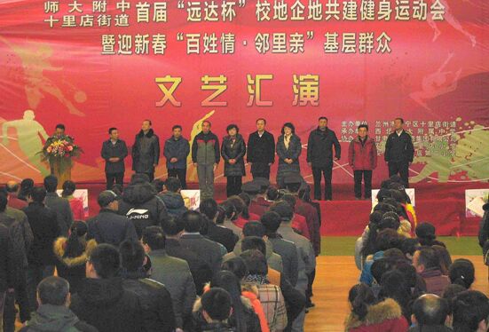 2015年12月27日,由西北師范大學(xué)附中和十里店街道籌備組織,由遠(yuǎn)達(dá)集團(tuán)獨(dú)立贊助的“首屆‘遠(yuǎn)達(dá)杯’校地、企地運(yùn)動(dòng)會(huì)”在位于安寧區(qū)的西北師范大學(xué)附中體育館舉辦。來自安寧區(qū)十里店街道轄區(qū)的10余個(gè)單位和甘肅遠(yuǎn)達(dá)集團(tuán)近500余人參加了當(dāng)天的開(閉)幕式和各項(xiàng)比賽。遠(yuǎn)達(dá)集團(tuán)劉羽桐董事長,副總裁宋佩新、副總裁張磊、財(cái)務(wù)總監(jiān)楊朝暉、房地產(chǎn)總經(jīng)理燕曉剛等領(lǐng)導(dǎo)蒞臨運(yùn)動(dòng)會(huì)現(xiàn)場并參加比賽、為運(yùn)動(dòng)員加油鼓勁,黨支部書記王生春代表集團(tuán)公司在開幕式上致辭,劉董事長,宋總、張總、楊總監(jiān)在閉幕式為獲獎(jiǎng)單位、運(yùn)動(dòng)員頒獎(jiǎng)。經(jīng)過激烈的比賽(籃球、拔河、羽毛球等項(xiàng)目在27日前已決出名次),遠(yuǎn)達(dá)集團(tuán)分別獲得“籃球男子組冠軍”、集體“優(yōu)秀組織獎(jiǎng)”、個(gè)人“優(yōu)秀組織獎(jiǎng)”、齊心協(xié)力賽“三等獎(jiǎng)”的成績。