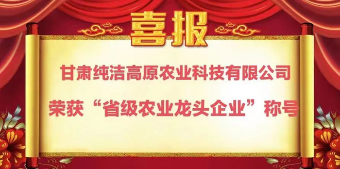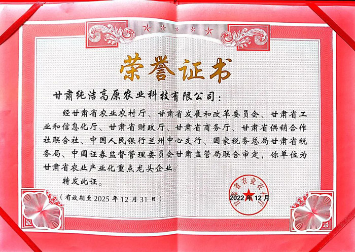 經(jīng)甘肅省農(nóng)業(yè)農(nóng)村廳、甘肅省發(fā)展和改革委員會、甘肅省工業(yè)和信息化廳、甘肅省財政廳、甘肅省商務廳、甘肅省供銷合作社聯(lián)合社、中國人民銀行蘭州中心支行、國家稅務總局甘肅省稅務局、中國證券監(jiān)督管理委員會甘肅監(jiān)管局聯(lián)合審定,我公司被評定為甘肅省農(nóng)業(yè)產(chǎn)業(yè)化重點龍頭企業(yè)。