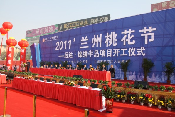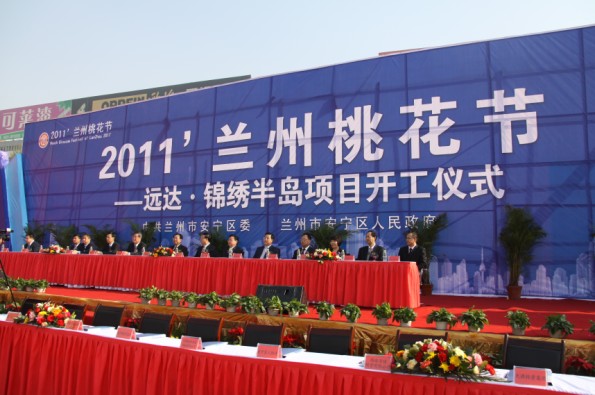 2011年4月19日,黃河北岸,安寧橋北側(cè)三區(qū)交匯處,鑼鼓喧天,彩旗飄飄。四十里黃河風(fēng)情線上最具國(guó)際特色的地標(biāo)性建筑群遠(yuǎn)達(dá)•錦秀半島項(xiàng)目舉行隆重的開(kāi)工奠基儀式。省委常委、市委書(shū)記陸武成,市委副書(shū)記、市長(zhǎng)袁占亭,市人大常委會(huì)主任哈全玉,市政協(xié)主席左燦湘,安寧區(qū)委書(shū)記、區(qū)長(zhǎng)席飛躍等省市區(qū)領(lǐng)導(dǎo)與遠(yuǎn)達(dá)投資集團(tuán)董事長(zhǎng)劉羽桐共同為項(xiàng)目奠基。安寧區(qū)八個(gè)街道、建筑單位及受邀嘉賓數(shù)百人參加了該項(xiàng)目的開(kāi)工奠基儀式。